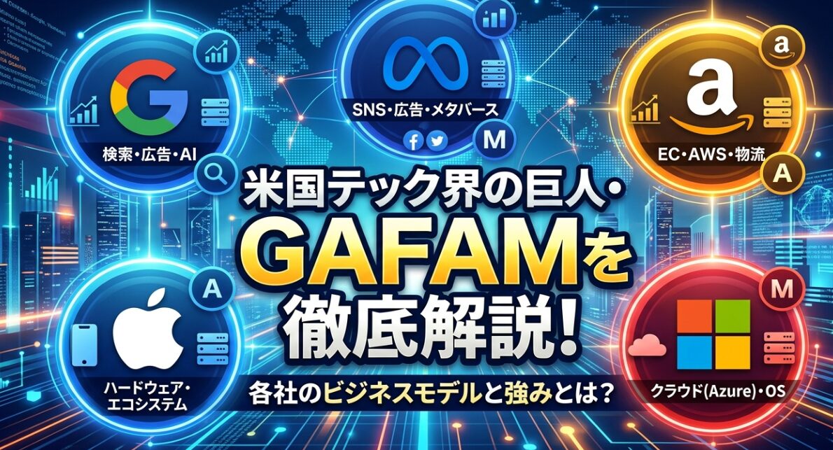 GAFAMとは、IT業界で大きな売上を上げている5社(Google、Amazon、Facebook、Apple、Microsoft)の頭文字を取った呼び名のことです。