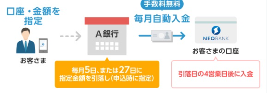 今回ご紹介する d NEOBANK(旧:住信SBIネット銀行)の定額自動入金サービスを使えば毎月決まった金額の振替を自動ですることができます。