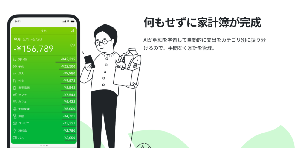 自動で支出・収入を分類し、家計状況をグラフ化。予算設定や資産管理も細かくできます、初心者でも簡単に始められます。