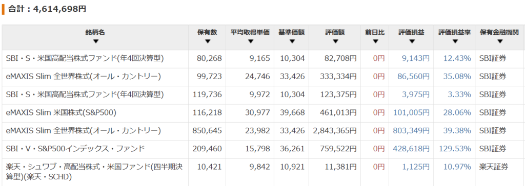 投資信託部分はSBI証券と楽天証券で旧NISAで購入していたSBIVシリーズと毎月積み立てのオルカン、S&P500が中心で一部SCHDを少額購入しています。