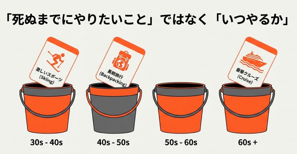 • 「タイムバケット(時間のバケツ)」を作る: 「20代でやりたいこと」「40代でやりたいこと」と、年代ごとにバケツを分けて書き出してみましょう。
