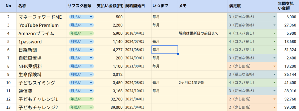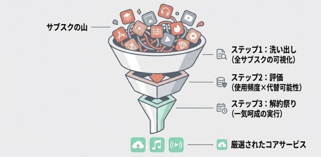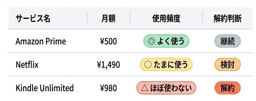 まず、過去3ヶ月分のクレジットカード明細と銀行口座の引き落とし履歴を確認してください。スプレッドシートやメモアプリに「サービス名・月額料金・最後に使った日・必要度」を書き出します。