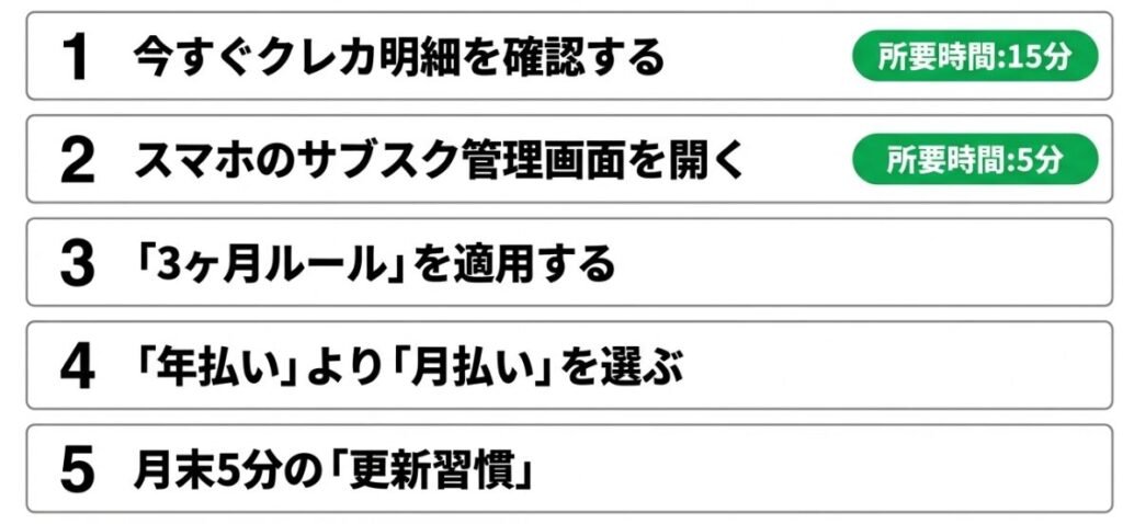 月に一度、リストを見直す習慣をつけるだけで、無駄な課金に気づくスピードが格段に上がります。