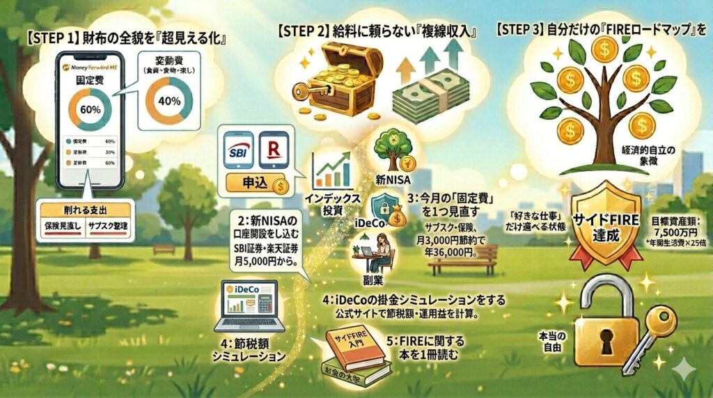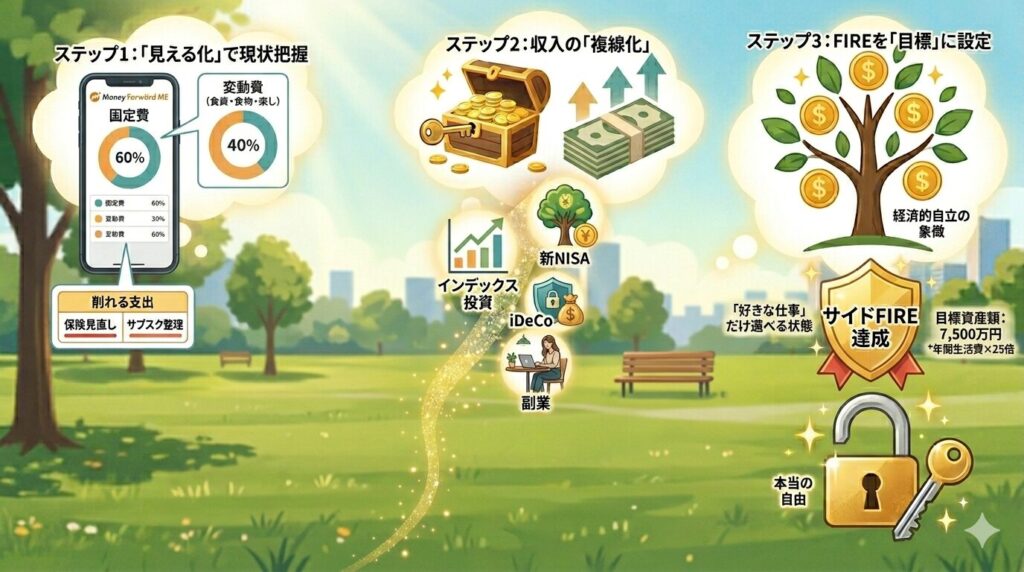 フルFIRE(完全退職)でなくても、「好きな仕事だけ選べる状態」をつくるサイドFIREが30代の現実的な目標です。