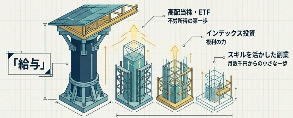 - スキルを活かした副業:本業のスキルを使ったフリーランス業務。最初は月数千円でも、積み重ねで大きな柱になります。