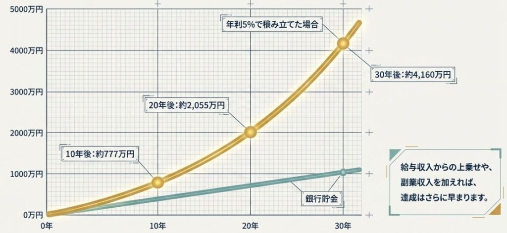 給与収入からの上乗せや、副業収入を加えれば、さらに早く達成できます。