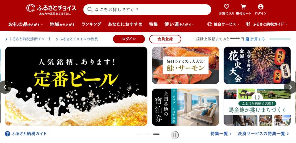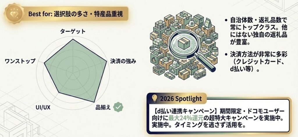 ふるさとチョイスは自治体数・返礼品数で常にトップクラス。他のサイトにない独自返礼品も多く、「この自治体から寄付したい」という明確な意志がある方に向いています。
