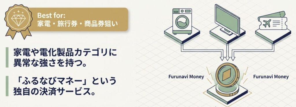 「ふるなびマネー」という独自の決済サービスを通じたキャンペーン(2026年4月現在、5%増量実施中)があり、ポイント規制後も独自の付加価値を出し続けています。