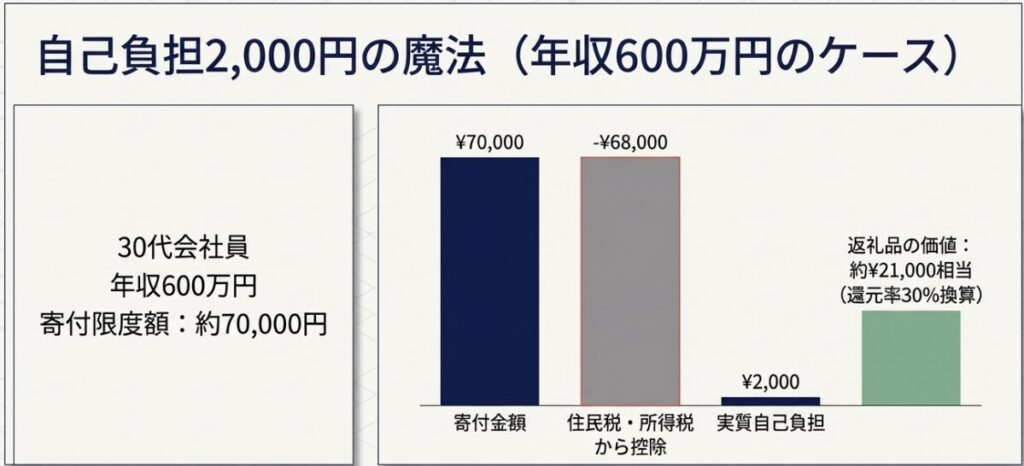 たとえば年収600万円の30代サラリーマンの場合、控除限度額はおよそ7〜8万円前後です。仮に7万円の寄付をすると、実質自己負担は2,000円で、その差額約68,000円が税金から戻ってくる(住民税・所得税控除)。