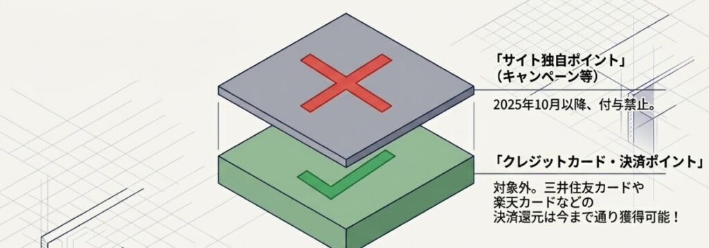 2025年10月以降は「サイトがポイントを付与するキャンペーン」は禁止になりましたが、クレジットカード側のポイント還元(三井住友カード、楽天カードなど)は対象外なので引き続き得られます。
