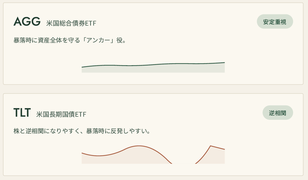 - AGG(米国総合債券ETF):安定重視。暴落時に資産全体を守る役割。