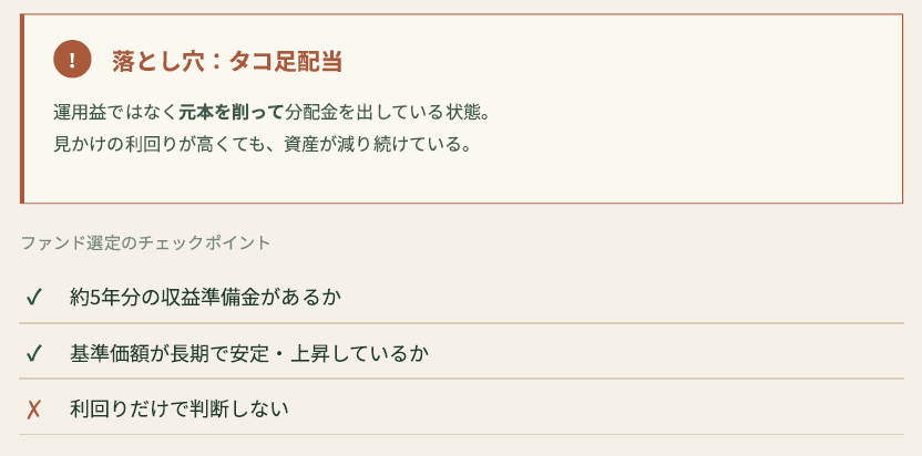 - ✅ 高配当ファンドの活用も検討するが、タコ足には注意