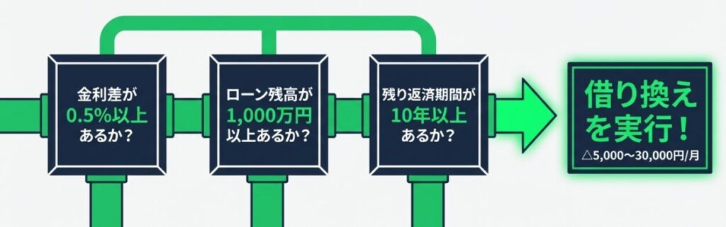 この3条件を満たす場合、借り換えコスト(手数料など)を考慮しても十分にメリットが出る可能性が高いです。
