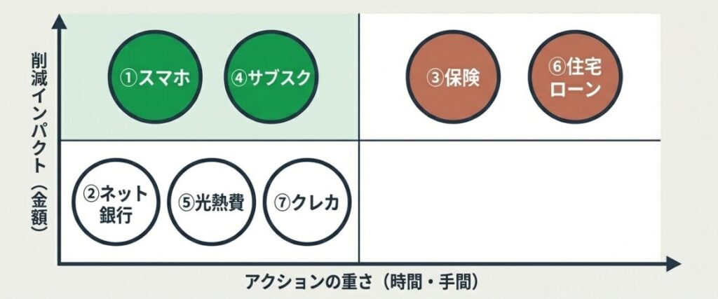 全部を一気にやらなくても大丈夫です。まず「スマホ」と「保険」だけ見直しても、月1〜2万円の削減になる方が多いです。