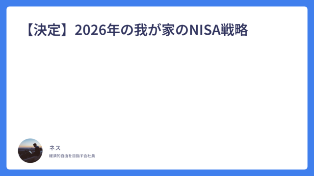 CATEGORY 投資 【決定】2026年の我が家のNISA戦略 2025.12.21 投資 ネス 30代妻子持ちサラリーマン みんなの積み立て投資額はどのくらい?日経新聞調べ 2025.11.09 インデックス投資 ネス 30代妻子持ちサラリーマン 住信SBIネット銀行(d NEOBANK)改悪?内容解説 2025.11.09 投資 ネス 30代妻子持ちサラリーマン 家計簿アプリおすすめ3選【無料&初心者向け】 2025.09.20 FIRE(経済的自由) ネス 30代妻子持ちサラリーマン 積立投資に最適なクレジットカード4選【ポイント還元率で比較】 2025.09.14 投資 ネス 30代妻子持ちサラリーマン 【ジム・ロジャーズ】世界的な大富豪が人生で大切にしてきたこと60 2023.01.28 投資 ネス 30代妻子持ちサラリーマン 【要約】月3万円で3408万円の超安心資産をつくる! 毎月5分のシン・米国株投資術 2023.01.14 投資 ネス 30代妻子持ちサラリーマン 【2025年8月時点】海外ETF 総資産ランキング 2022.12.30 投資 ネス 30代妻子持ちサラリーマン 【ニュース】新NISA変更点のポイント 2022.12.25 ニュース ネス 30代妻子持ちサラリーマン 【要約】世界一面白くてお金になる経済講座 2022.11.12 投資 ネス 30代妻子持ちサラリーマン もっと見る